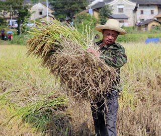 金黄的田野,收获的季节,我市今年种植高产中稻近10万亩,平均亩产超过1300斤,总产值近2亿元。图为该市兴宁镇岭脚村村民樊爱平一家正在收割中稻。(王跃华)