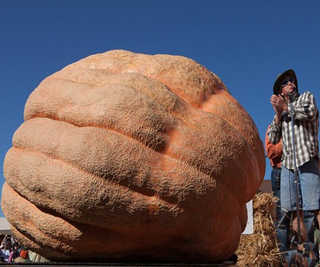 当地时间2014年10月13日,第41届西夫韦世界南瓜大赛在美国加州的半月湾市举行,来自美国纳帕的John Hawkley以其2,058磅(约合933公斤)重的大南瓜刷新纪录赢得冠军。(中新网)