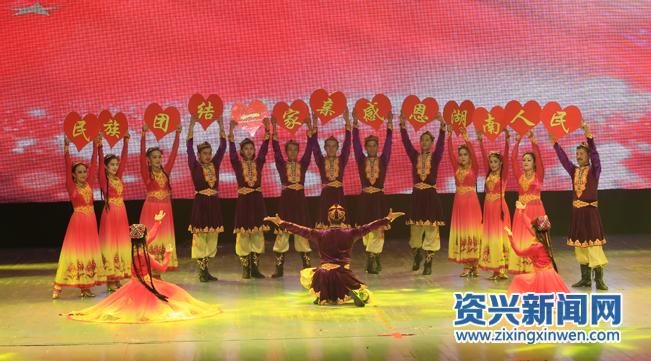 演出在歌舞《资兴欢迎你》中拉开序幕。富有浓郁新疆民族特色的歌舞《吐鲁番的葡萄熟了》、《和谐新疆》和充满郴州本土人文气息的节目《伴嫁歌·峨眉姐》、《九哥与海妹》等节目淋漓尽致地展现了两地的民族文化特色。歌舞《感恩湖南》舞姿奔放,步伐明快,表达了托克逊人民对湖南、对郴州的感谢,观众掌声热烈。根据维吾尔族青年海比尔·艾合麦提和汉族兄弟周祚宏联手救人的事迹改编而成的小品《牵手》更是让现场观众在笑声中收获了感动。演出在歌舞《祖国我的最爱》中圆满结束。身穿着民族传统服饰的表演者们,以热情奔放的表演展示了各民族丰富多彩的文化,涌现了中华民族文艺百花齐放的活力。