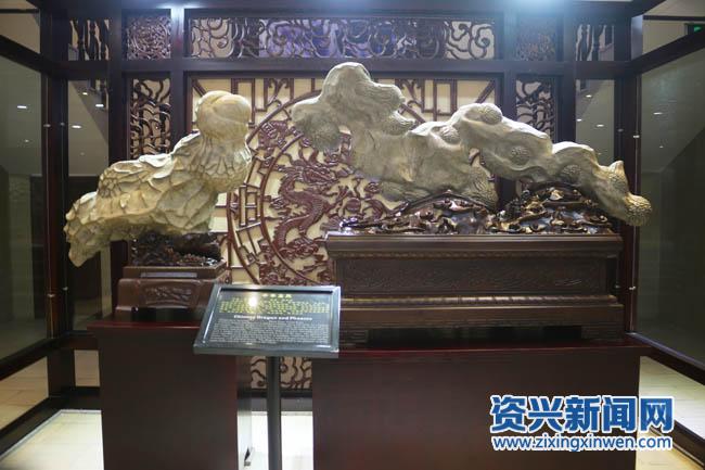 获“大世界基尼斯之最”称号的两块奇石分别是“中华龙凤组合石”“千年寿龟石”,两块奇石同为雅丹石,产地新疆,石头神形气韵浑然一体,造型奇特逼真。