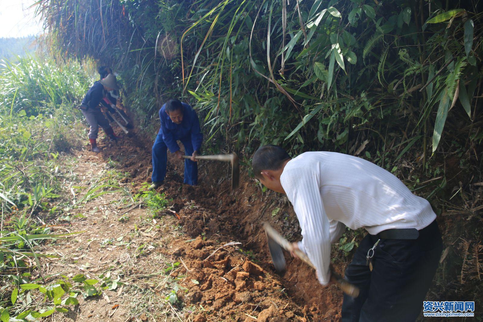 兴宁镇百嘉洞村的贫困户上山义务开挖沟渠