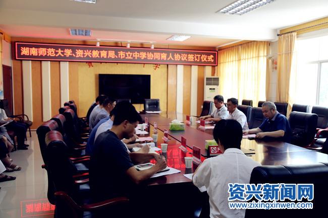 资兴新闻网讯(记者 王瑞琴)8月22日,湖南师范大学外国语学院、资兴市教育局、市立中学协同育人合作协议签约仪式在市立中学举行。