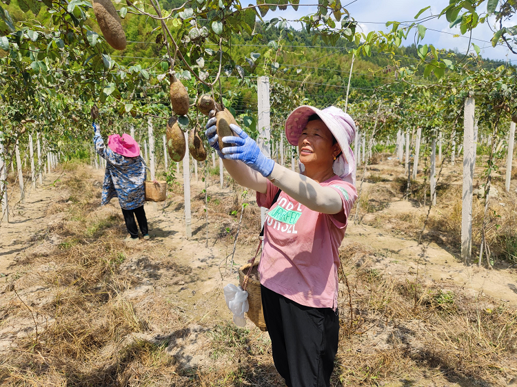 木通果,又叫“八月炸”,耐贮存,食用口感好,有较大的药用价值,亩均产量为4000斤,市场最低收购价为3元/斤,除去生产管理成本后,每亩能有8000-9000元纯收入,经济效益十分可观。目前,该乡木通果种植面积已达700亩。