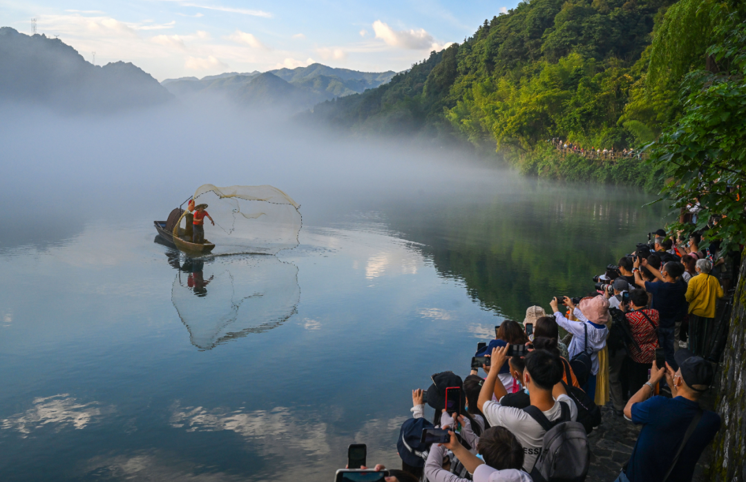 (清晨雾漫小东江,人群拥至,争相出镜。郭立亮 摄)