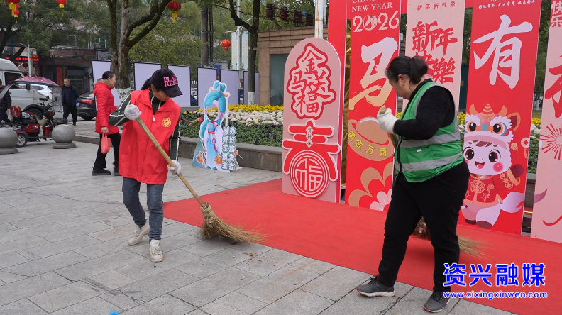 人潮涌动处,园林管理处的邓德香和她的同事正挥舞着手中的扫帚,及时清理果皮纸屑与废弃包装,确保现场干净整洁。从清晨开市到日暮收摊,她们始终坚守岗位,用辛勤劳动守护集市颜值,以最美姿态为市民、游客营造舒心环境,成为集市里一道亮丽的风景线。“人民广场这么多人,我们把卫生打扫干净给市民、游客带来方便。”邓德香介绍道。