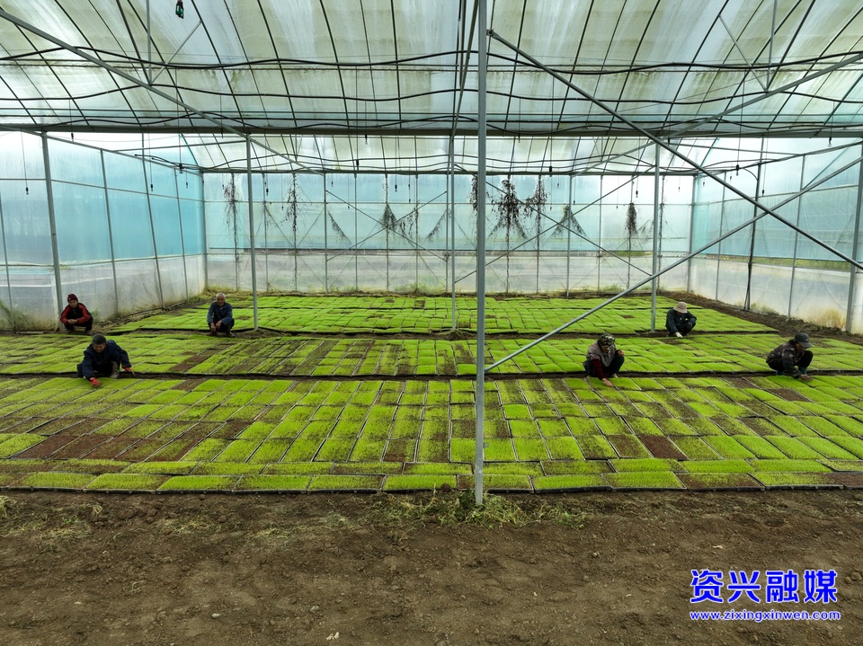 春日时节,唐洞街道镜塘村育秧大棚内一派繁忙,农户们正抢抓农时开展集中育秧,摆盘、覆土、播种等流程有序推进,一排排秧床整齐规范,嫩绿的秧苗生机勃勃。