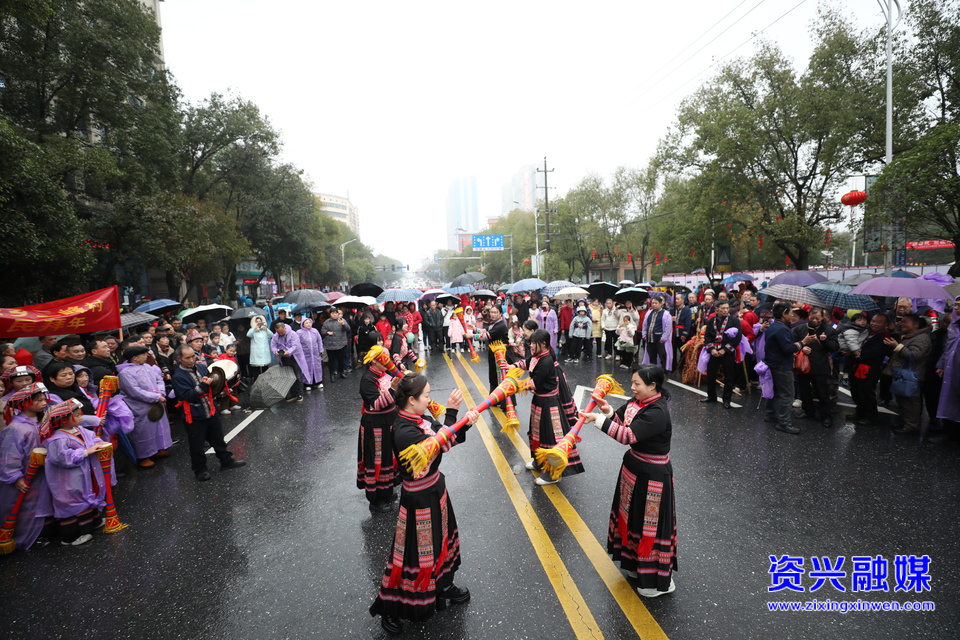 队伍中最具特色的,当属来自回龙山瑶族乡二峰村和唐洞街道茶坪瑶族村的非遗方阵。金黄的稻草扎制成的草龙,在舞龙者手中翻腾跳跃,散发着泥土的芬芳与农耕文明的古朴气息,不仅展现了瑶族同胞的精气神,更让围观的市民和游客近距离感受到非遗的独特魅力。“我很开心代表瑶族来参加这次活动,我希望长大以后努力学习传承好瑶族文化。”二峰村小学生表演者刘淼兴奋地说。