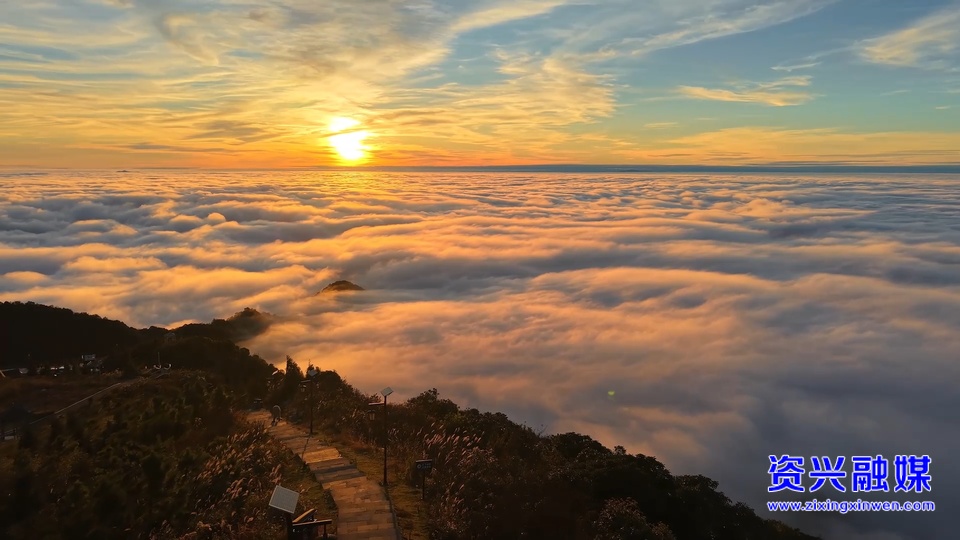 回龙山海拔1413米,是国家4A级旅游景区、资兴古八景之一,凭借高海拔地势与温润的气候条件,一年中超200天可观赏到云海奇观。近期气温回暖,山间积蓄的水汽持续蒸腾升腾,在微风与山势的共同作用下,汇聚成连绵不绝的云海,远远望去,洁白云雾如棉絮铺展,将青翠的峰峦、蜿蜒的山道轻轻笼罩,宛若海中仙岛,尽显空灵缥缈。