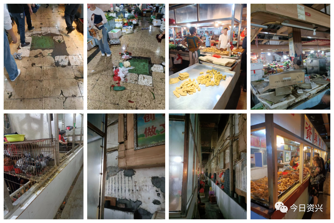 在兴华市场内,发现走道部分瓷砖破损,藏污纳垢;走道内摊贩将垃圾、菜叶随处丢弃,没有及时清扫,也无垃圾桶,122号摊位及139号摊位杂物成堆;熟食区工作人员未佩戴口罩也无防蝇设施;宰杀家禽区后面电线乱搭,墙壁结满蜘蛛网,家禽摊位无防护措施,家禽粪便、垃圾长期未清扫,臭气熏人。