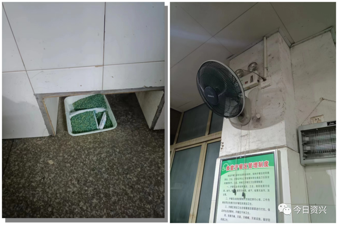 在市立中学食堂二楼,发现部分垃圾箱盖子未及时盖好,易滋生蚊、蝇;食堂二楼食物存储室放有一盘老鼠药;应急灯未接通电源,存在安全隐患。