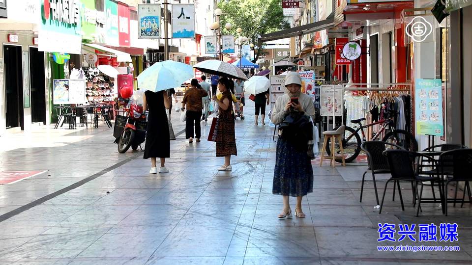 7月16日,记者在共惠步行街看到,即使是高温天气,街上依旧人头攒动,人来人往,但市民们都做足了外出准备,全方位配备了防晒衣、遮阳伞等防晒措施。