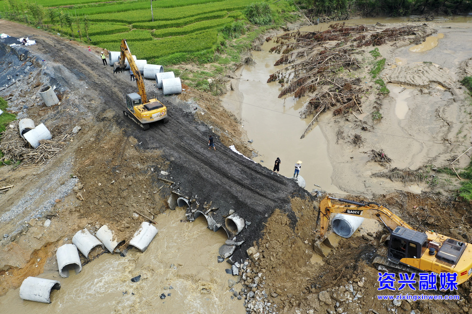 8月16日,为积极应对新一轮强降雨,施工队正在抢修加固八面山瑶族乡的坪田桥。