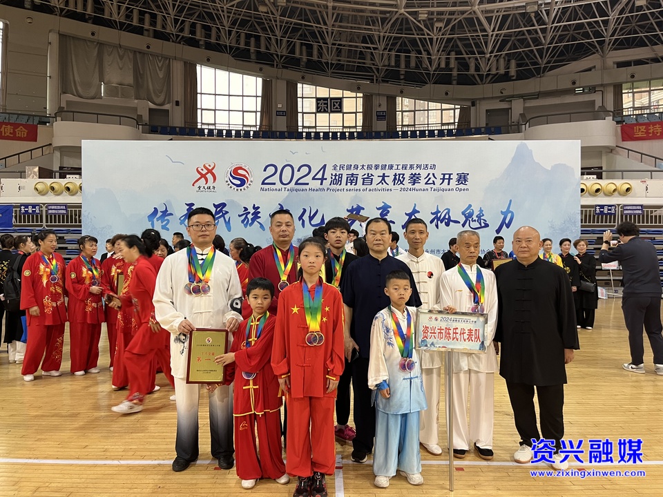 资兴市陈氏太极拳协会共派出9名队员参赛,获得7金9银7铜的好成绩,其中11岁的黄炜鑫第一次参赛就获得了儿童A组2枚金牌,教练贾震、曹伟还分别获得了男子D1组全能冠军和季军。