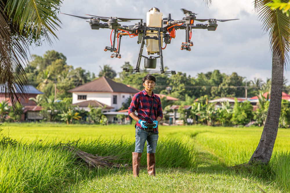 2022年8月1日,农民在泰国黎逸府操作大疆农业植保无人机。近年来,以植保无人机为代表的智能化机械在农业生产中大显身手。中国制造的农业植保无人机为泰国当地农民赋能,推动农业生产更加高效安全。