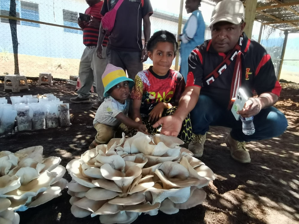 2025年9月29日,在巴布亚新几内亚东高地省首府戈罗卡市,当地民众参观中国援巴布亚新几内亚菌草旱稻项目永久性示范基地种植的大平菇。2018年以来,中方在当地举办技术培训班41期,培训学员3200余人,技术推广到巴新10个省20个地区,成千上万当地民众从中受益。