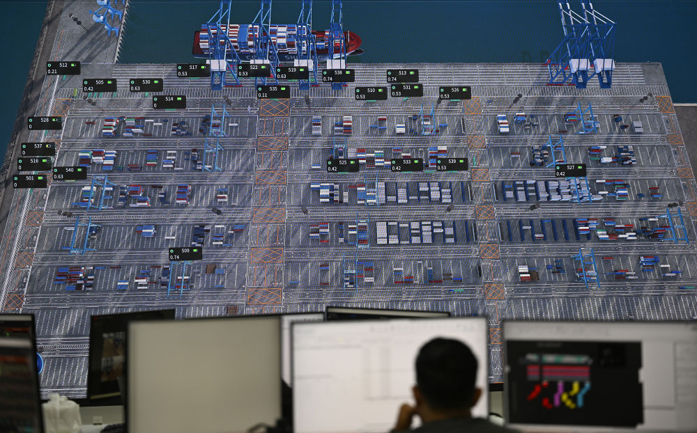 2025年5月16日,在秘鲁钱凯港的中远海运港口秘鲁钱凯公司前方运营大楼,工作人员通过屏幕监测港口运行情况。钱凯港是中国与秘鲁共建“一带一路”标志性项目,2024年11月正式开港,成为连接亚洲与拉美最重要的航运枢纽之一。
