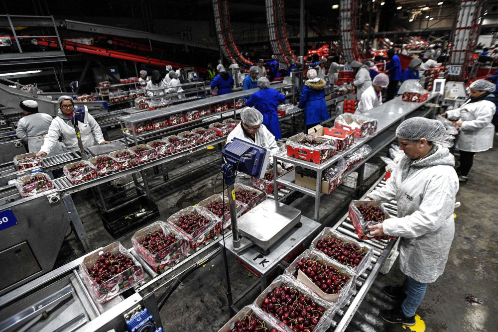 2024年12月13日,工作人员在智利莫斯塔萨尔的一家吉制公司工厂处理车厘子。中国已连续7年成为智利车厘子的最大出口国,超过90%的智利车厘子销往中国。越来越多的智利特色农产品在不断丰富中国百姓的餐桌。