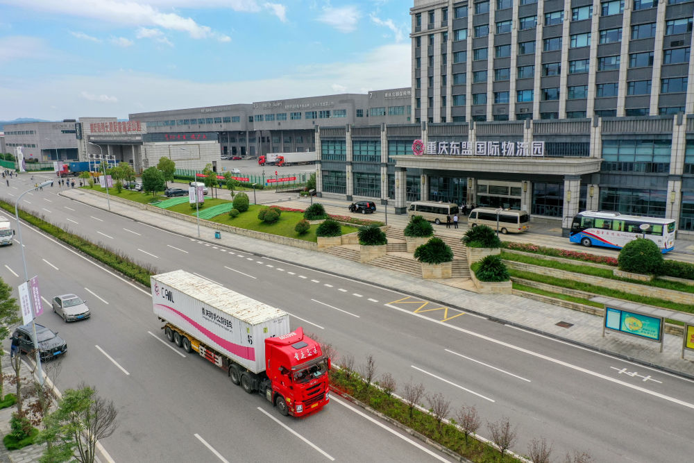2023年10月11日,满载笔记本电脑配件、发电机组件等产品的西部陆海新通道跨境公路班车从重庆南彭公路保税物流中心驶出,途经广西凭祥,直达越南(无人机照片)。