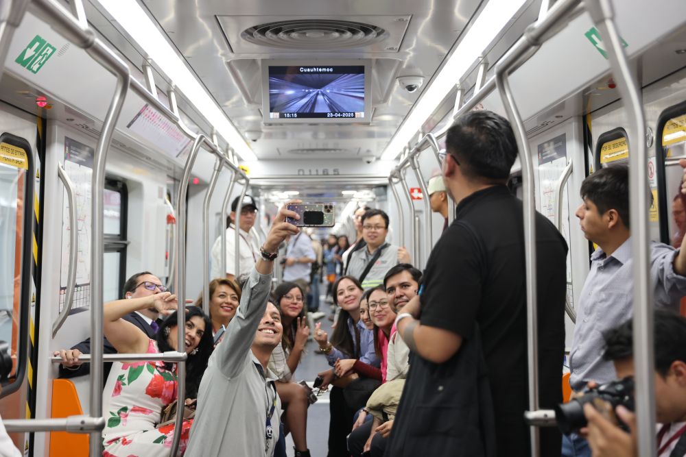 2025年4月23日,在墨西哥首都墨西哥城,媒体记者在地铁新1号线列车上合影。当日,墨西哥城地铁新1号线举行部分通车仪式,中国企业助力全面升级系统设备,改善市民通勤体验。