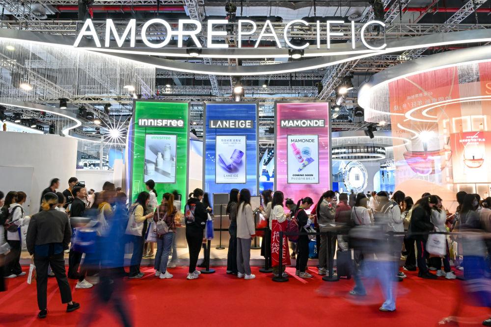 这是在上海举行的第七届中国国际进口博览会消费品展区拍摄的爱茉莉太平洋展位(2024年11月7日)。韩国化妆品企业爱茉莉太平洋已连续七年参加进博会,为中国消费者提供多元化产品。