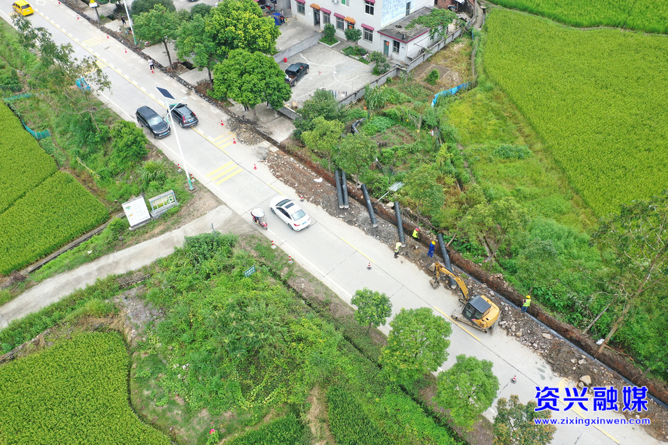 2024年8月16日,在资兴市兴宁镇西坌村路段,郴电国际郴州市自来水公司工作人员正在铺设供水管道。