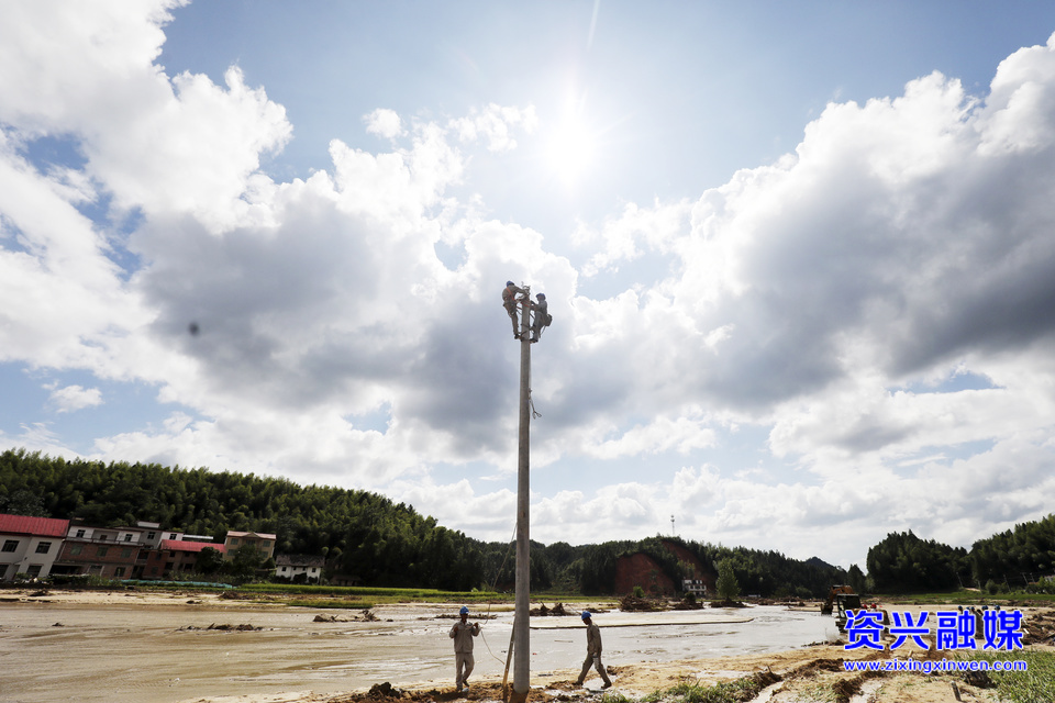 2024年8月1日,在资兴市州门司镇白筱村,电力工人正在第一时间抢修电路保供电。