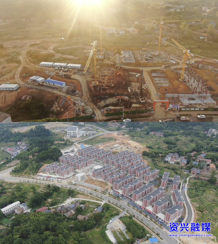 上图为2024年10月24日拍摄的资兴市兴宁镇集中安置点项目建设现场,下图为2025年7月27日拍摄的建成投用的资兴市兴宁镇集中安置点项目。