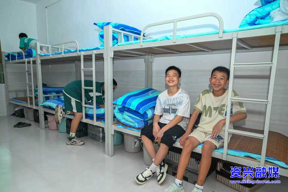 2024年8月31日,新学期开学之际,在资兴市第二中学,来自州门司镇中学的学生在宿舍楼里休息,学校为他们专门配齐床上用品、生活用品。