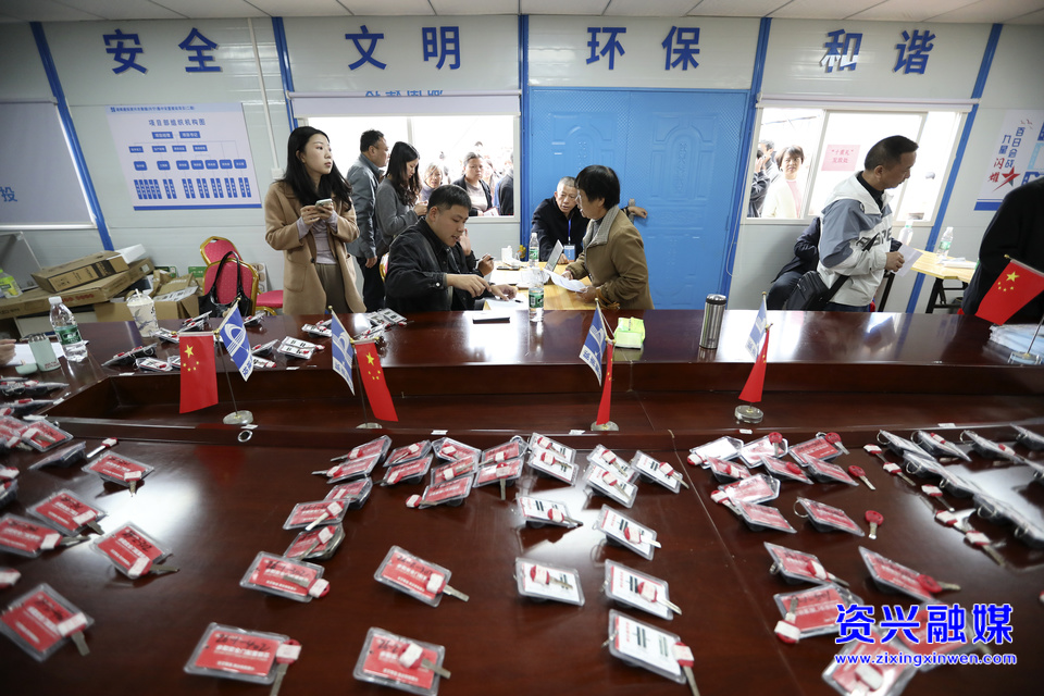 2025年4月7日,在资兴市兴宁镇集中安置点二期交房仪式现场,安置户在领取新房钥匙。