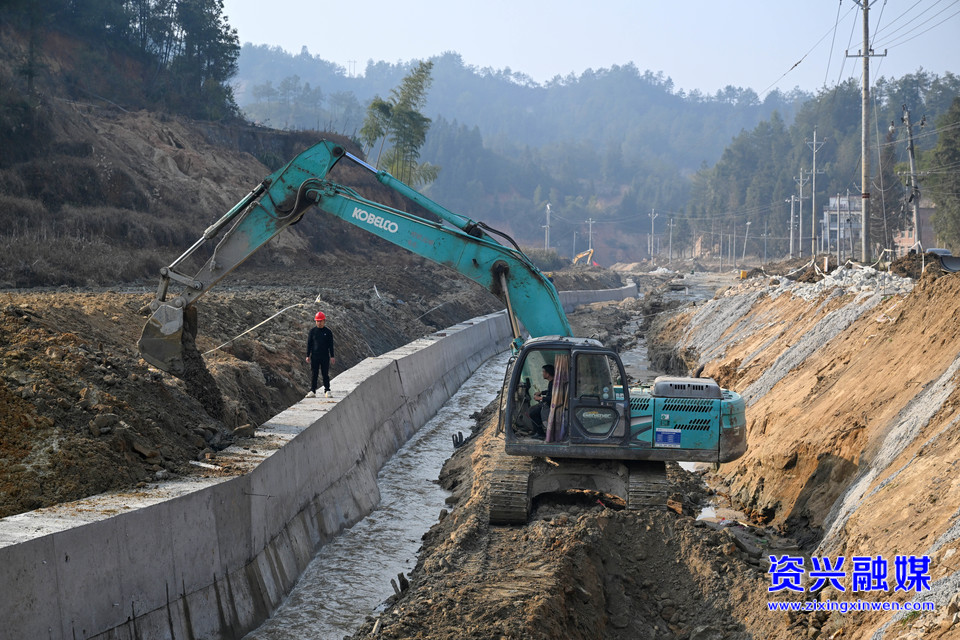 2025年2月26日,在资兴市八面山瑶族乡豪园村,施工人员正在修筑河堤、治理河道。