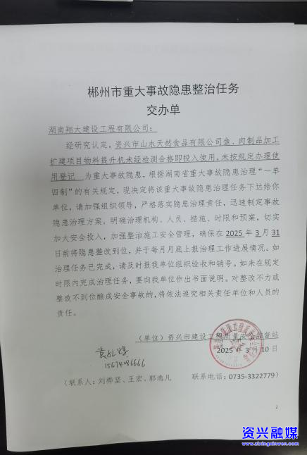 隐患问题:资兴市山水天然食品有限公司鱼、肉制品加工扩建项目物料提升机未经检测合格即投入使用,未按规定办理使用登记,存在重大安全隐患。