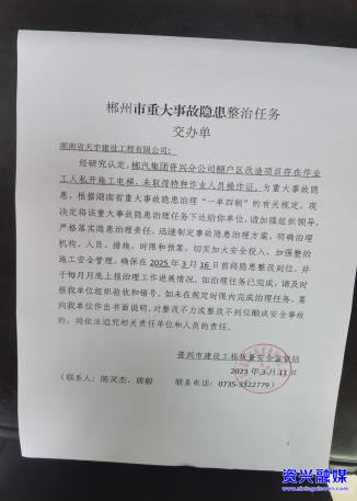 隐患问题:郴汽集团资兴分公司棚户区改造项目(1#、4#栋)建筑施工特种作业人员未取得有效特种作业人员操作资格证书上岗作业,存在重大安全隐患。