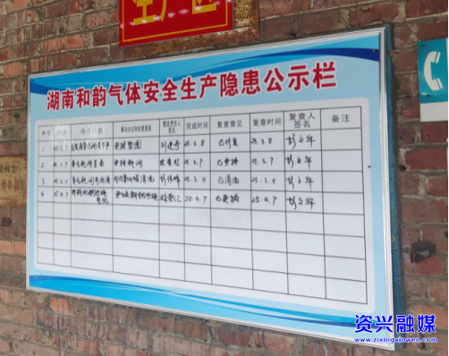 隐患问题:1、隐患公示栏损坏未及时更新。2、氧气充装车间警示标识不全。