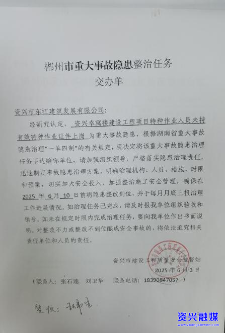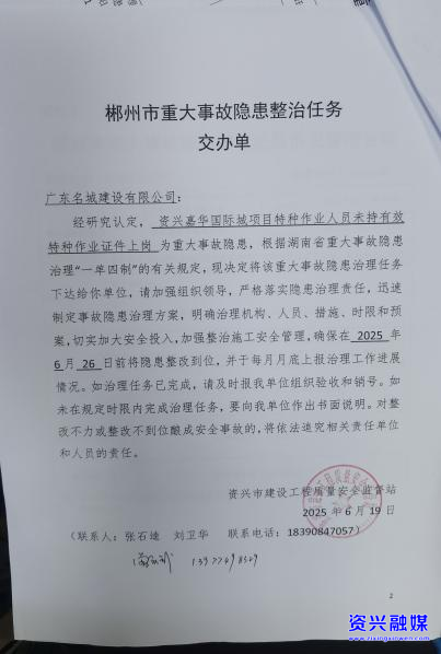 隐患问题:资兴嘉华国际城项目特种作业人员未持有效特种作业证件上岗,存在重大安全隐患。