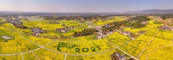 今年3月22日,资兴市蓼江镇万亩油菜花竞相绽放,与群山、村落交相辉映,构成一幅春日田园画卷。郭立亮 朱孝荣 摄